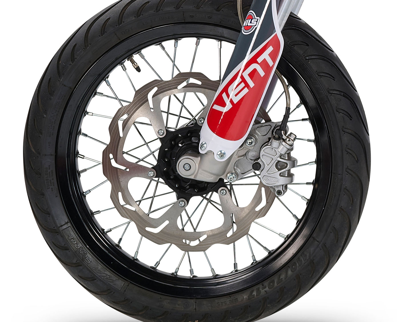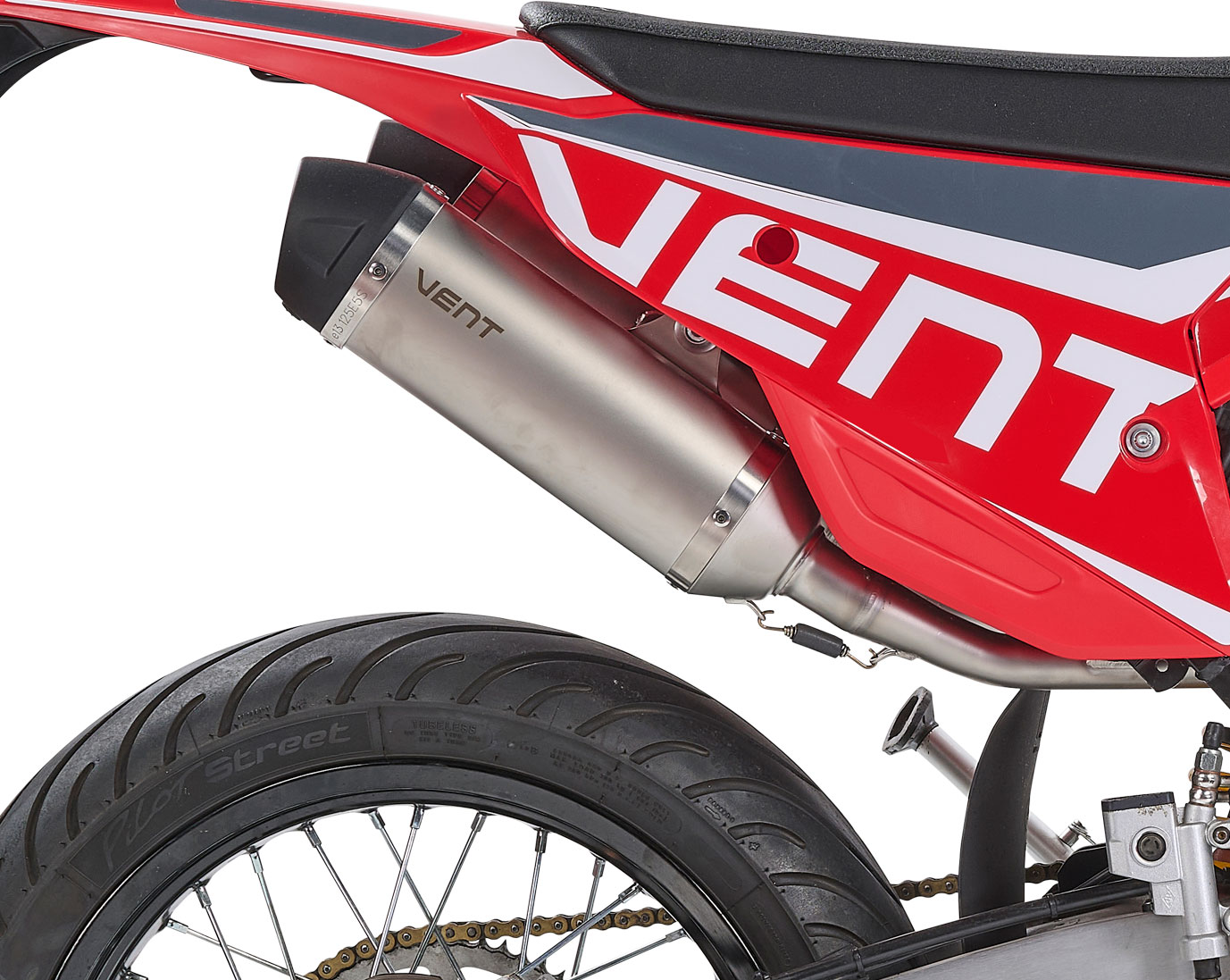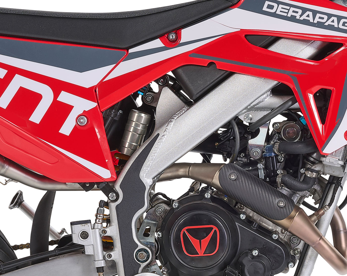 La nuova DERAPAGE RR 125 è una motard estremamente moderna, ultra raffinata e decisamente prestazionale: parliamo di una moto esclusiva! Elemento fondamentale di questo modello è il nuovissimo motore Minarelli 125 4T con omologazione Euro5: un propulsore brillante ed estremamente affidabile, caratterizzato dal nuovo sistema a fasatura variabile. Il telaio perimetrale VENT 6.0 a doppia culla con parte posteriore scomponibile e il forcellone sono in alluminio, mentre la forcella idraulica up-side-down con steli da 41 mm-R16V e il monoammortizzatore idraulico (con leveraggio HM link) sono regolabili in precarico ed estensione, tutte caratteristiche esclusive della versione RR. Uniti al nuovo e potente impianto frenante realizzato da BCA (coadiuvato da sistema CBS di ripartizione della frenata) e alla frizione antisaltellamento, rendono DERAPAGE RR 125 una moto davvero all’avanguardia, piacevole e maneggevole su strada, capace di creare ricordi indimenticabili. Completano la dotazione di serie anche il doppio silenziatore e il bellissimo manubrio Black Finish da 28 mm con piastre di sterzo dedicate.