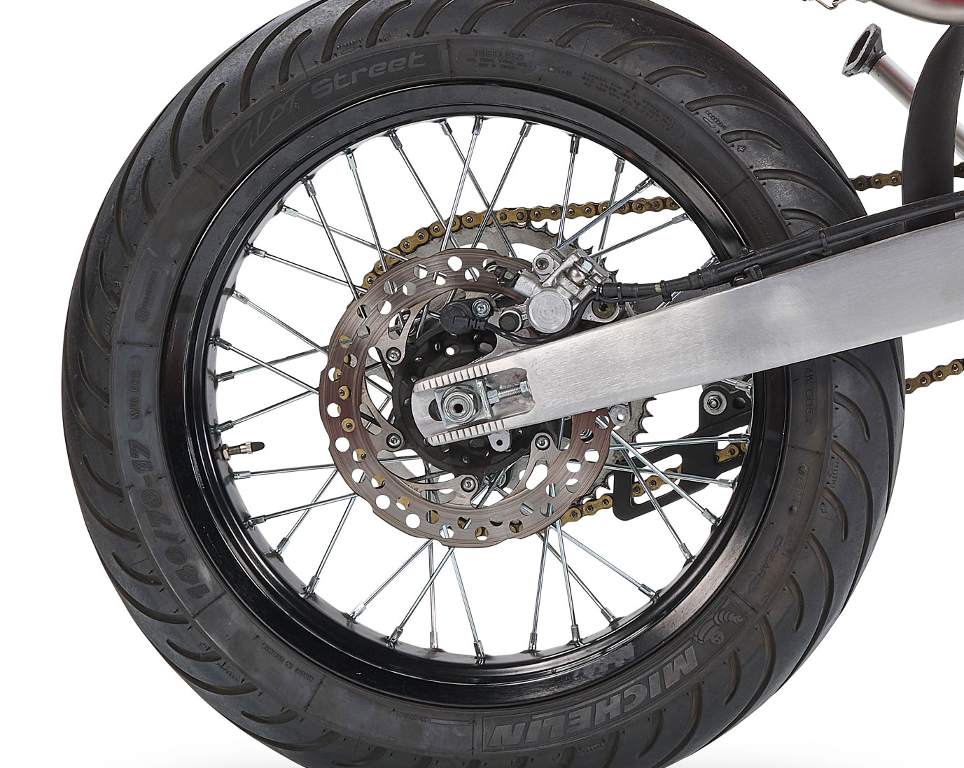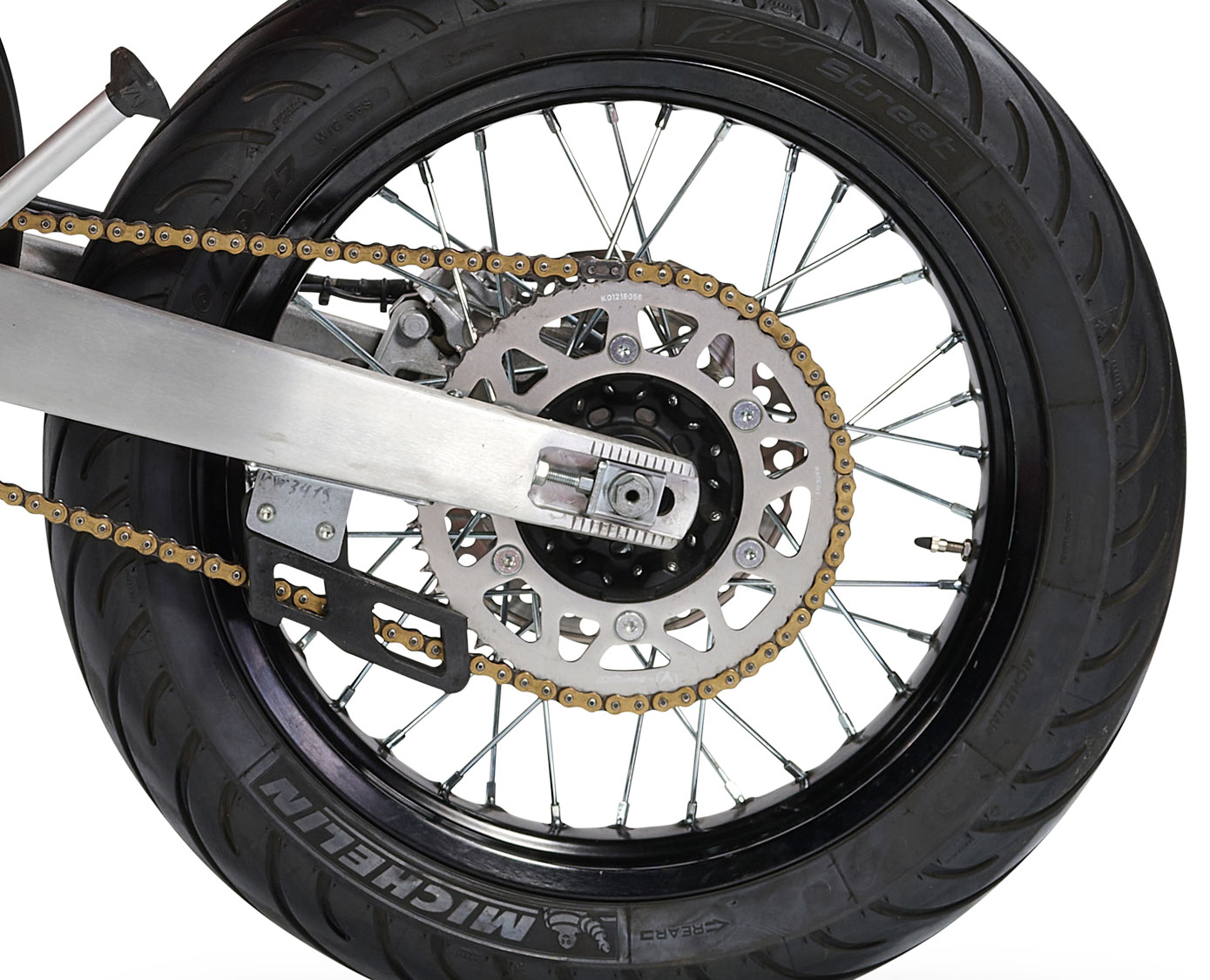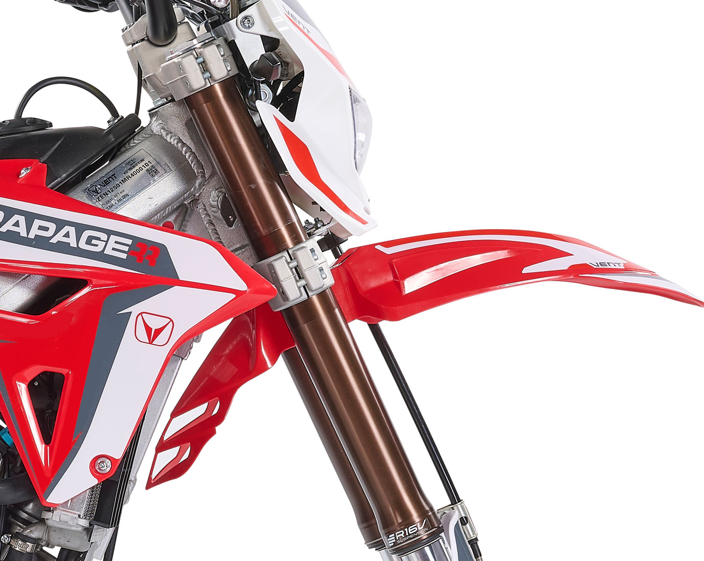 La nuova DERAPAGE RR 125 è una motard estremamente moderna, ultra raffinata e decisamente prestazionale: parliamo di una moto esclusiva! Elemento fondamentale di questo modello è il nuovissimo motore Minarelli 125 4T con omologazione Euro5: un propulsore brillante ed estremamente affidabile, caratterizzato dal nuovo sistema a fasatura variabile. Il telaio perimetrale VENT 6.0 a doppia culla con parte posteriore scomponibile e il forcellone sono in alluminio, mentre la forcella idraulica up-side-down con steli da 41 mm-R16V e il monoammortizzatore idraulico (con leveraggio HM link) sono regolabili in precarico ed estensione, tutte caratteristiche esclusive della versione RR. Uniti al nuovo e potente impianto frenante realizzato da BCA (coadiuvato da sistema CBS di ripartizione della frenata) e alla frizione antisaltellamento, rendono DERAPAGE RR 125 una moto davvero all’avanguardia, piacevole e maneggevole su strada, capace di creare ricordi indimenticabili. Completano la dotazione di serie anche il doppio silenziatore e il bellissimo manubrio Black Finish da 28 mm con piastre di sterzo dedicate.