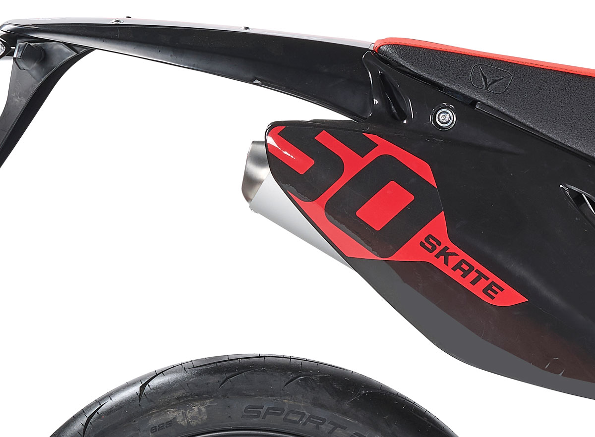 La piu’ avanzata motorizzazione Minarelli 50 cc 2T di ultima generazione, l’unico telaio perimetrale derivato dalle moto da cross e il potente impianto frenante posizionano SKATE 50 al top del suo segmento in termini di qualità, valore, affidabilità e sicurezza.